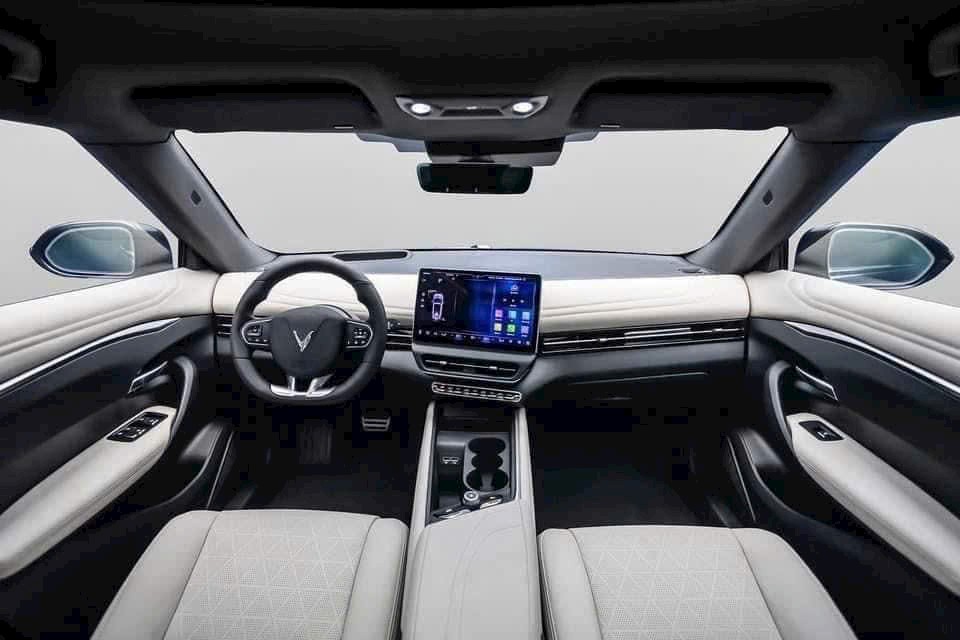 VinFast VF7 có nội thất rộng rãi, sang trọng. Xe được trang bị màn hình giải trí trung tâm 12,9 inch, hệ thống hiển thị thông tin trên kính lái HUD, vô lăng D-cut, ghế bọc da,... Xe có cấu hình 5 chỗ ngồi.